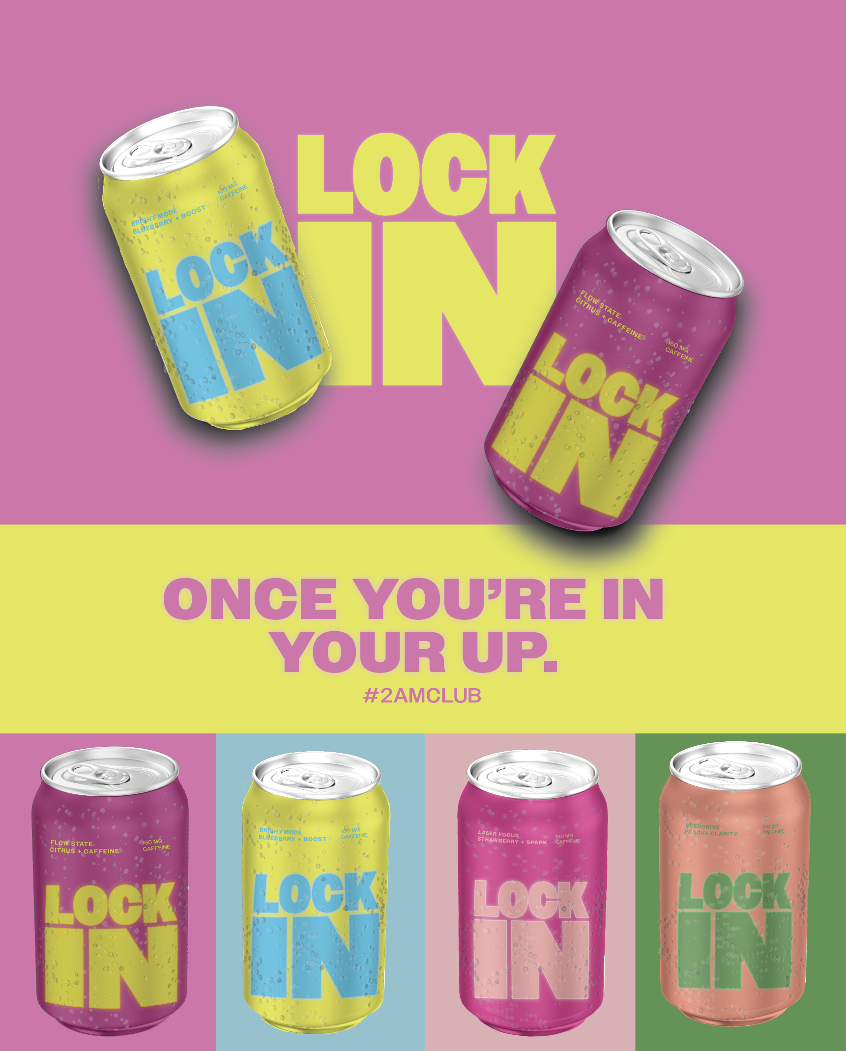 LOCK IN is a mock branding project for a fictional energy drink company. Designed with students and a younger, late-night audience in mind, the concept centers around the #2AMCLUB those cramming for exams, pulling all-nighters, and pushing through deadlines. The visual direction uses bold typography and bright, high-contrast color palettes to feel energetic, playful, and youth-oriented, reinforcing the idea of staying alert and “locked in” when it matters most.